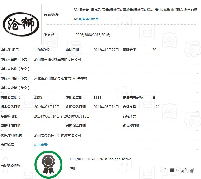 幸福調(diào)味品自創(chuàng)辦30多年以來,在工商部門指導(dǎo)下,充分認(rèn)識(shí)到商標(biāo)品牌的重要性,始終堅(jiān)持走創(chuàng)品牌的路子。公司的“康頌”商標(biāo)于1997年在30類,糖、茶、糕點(diǎn)、調(diào)味品類獲核準(zhǔn)注冊(cè)后,并根據(jù)市場需要,先后又注冊(cè)了包括“滄獅”中文及拼音在內(nèi)的等商標(biāo);形成了涵蓋多類別、多商品、多層次的商標(biāo)品牌庫。